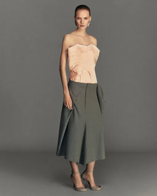 Как описать эту модель? Представьте классические туфли или мюли, у которых аккуратно «срезали» верхнюю часть. В результате получается силуэт, который балансирует между закрытой и открытой обувью. Стопа остается частично открытой, но при этом сохраняется ощущение цельной формы. Именно за счет этого контраста пара выглядит свежо и современно. Первой эту идею вывела в тренды Виктория Бекхэм. В ее интерпретации это изящные босоножки на шпильке, в которых стопа будто «утопает». Они легко могут заменить привычные остроносые туфли-лодочки, с которыми ассоциируется эстетика бренда. Со своей стороны Chloé под руководством Чемены Камали предлагает более романтичное прочтение. В коллекциях появляются прозрачные версии, почти как у Золушки, а также мюли с едва заметными перемычками. Также у отечественных марок мы увидели виды в духе вьетнамок на каблуке.