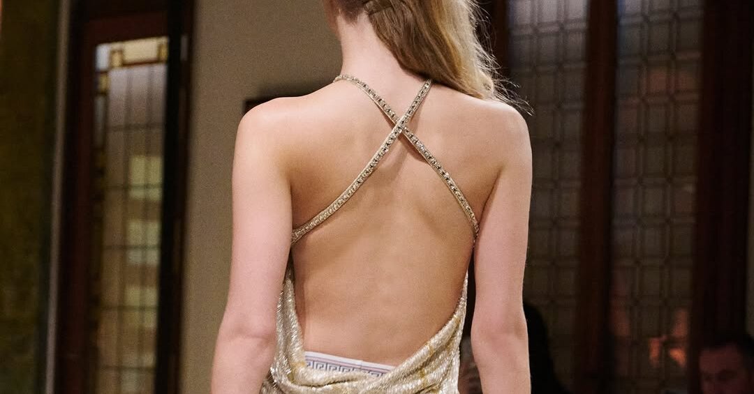 Если у вас впереди важное событие или просто есть настроение добавить в гардероб вещь с характером, этот тренд стоит рассмотреть в первую очередь. Начать логично с платья. Дизайнеры словно сговорились: именно этот элемент раскрывает идею максимально точно. На подиуме мы видели и драматичные варианты, и сдержанные, но эффект в обоих случаях один — внимание вам гарантировано. Кейт Мосс закрыла показ Gucci в черном макси с пайетками и длинными рукавами. Демна Гвасалия, вдохновляясь ДНК бренда времен Тома Форда, делает ставку именно на чувственность на грани с провокацией. Дарио Витале, пусть и ненадолго, но очень точно, возвращает нас в эстетику Versace времен самого Джанни — и, конечно, не обходится без сверкающего платья с открытой спиной. И даже лаконичные модели дадут тот самый эффект, который сложно повторить другими способами. А вот от платьев в длине мини лучше все-таки отказаться: иначе аутфит выйдет слишком откровенным. Если не хочется уходить в вечернее настроение, присмотритесь к топам. На бретелях, с воротником халтер или с высоким горлом. Они легко интегрируются в привычные ансамбли — с брюками, джинсами и даже брюками-капри.