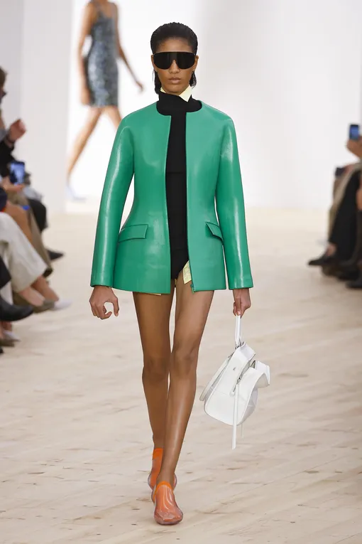 На каких шоу появились такие изделия? Конечно, стоит начать с главного бренда, который славится своим ироничным тоном и призывает относиться к моде максимально играючи, не создавая глубинных философских смыслов. Речь идет про Loewe, который с уходом Джонатана Андерсона не потерял своей саркастичной нотки, а, наоборот, приобрел еще больший модный юмор. Смотря на ярко-зеленый жакет, который слегка переливается при свету, сложно представить, что это не пластилиновая поделка новых креативных директоров Джека Макколоу и Лазаро Эрнандеса. Тот же эффект наблюдается и у коллекции бренда MM6 Maison Margiela, который продемонстрировал более матовый вариант пластилиновых вещей. Этот костюм с юбкой в стиле Chanel идеально подойдет всем, кто хотел бы пополнить гардероб легендарным сетом и при этом убрать из него всю серьезность и «нафталиновое» настроение, которое достигается за счет твида и черно-белой палитры.