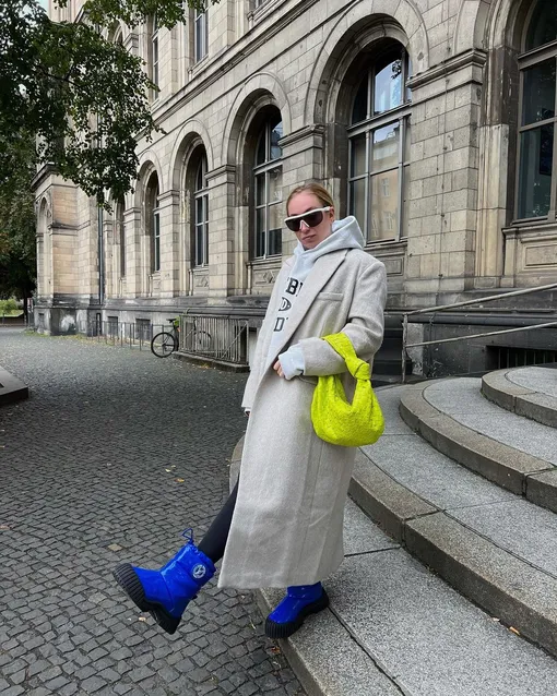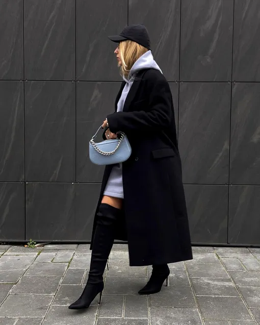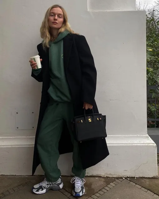Если хочется максимального комфорта, добавьте к толстовке такие же мягкие джоггеры (они могут быть одного с ней цвета и образовывать костюм или контрастные), а сверху — классическое длинное пальто прямого кроя. Дополните образ парой удобных кроссовок или ботинок челси и удобной сумкой простой геометричной формы — и ваш универсальный, стильный и очень удобный наряд готов.