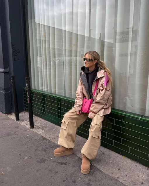 И все же удобнее всего носить толстовку с теплой курткой. Чтобы образ выглядел стильно, в него стоит добавить пару трендовых вещей. Например, широкие брюки карго и угги. Получится комфортное комбо, в котором можно провести целый день (на прогулку за городом или в парке) или отправиться на воскресный завтрак с друзьями.