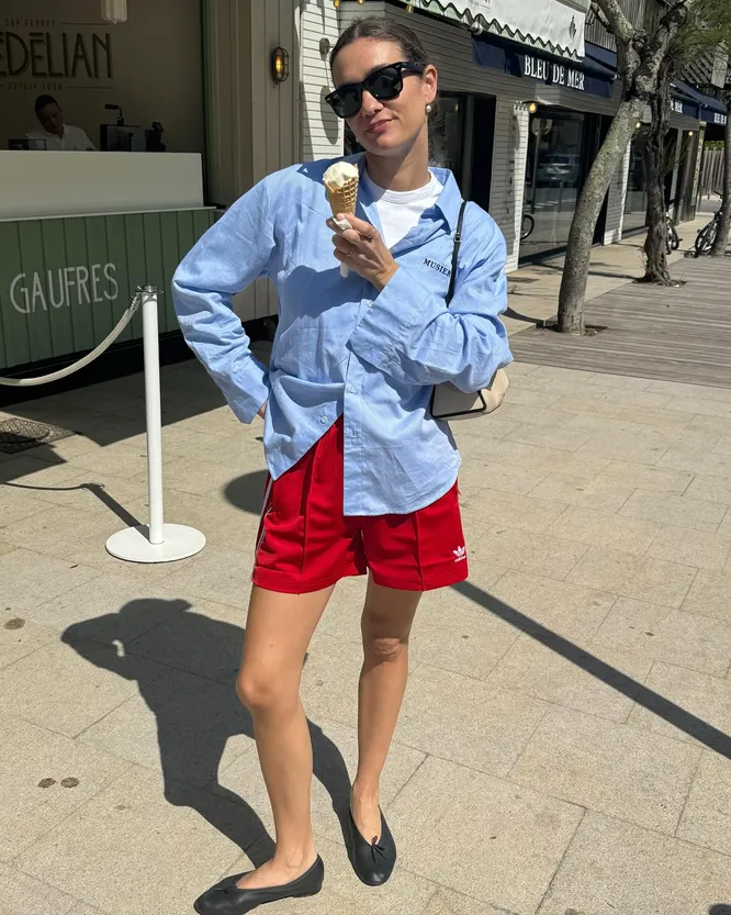 Чтобы образ с базовой футболкой не выглядел скучно, предлагаем носить ее с самыми трендовыми вещами этого лета. Например, со спортивными шортами с лампасами, как в 2010-х. Лучше всего остановиться на модели яркого цвета: красного, синего или зеленого — такие выступят в аутфите стильным акцентом. А поверх футболки можете надеть классическую рубашку. На контрасте со спортивными шортами она будет смотреться очень интересно. Обувь тоже предлагаем выбирать не самую очевидную — элегантные балетки. Их сочетание с трениками и шортами с лампасами сейчас на пике популярности. Финальный штрих — солнечные очки и вместительная сумка: теперь можно смело отправляться по всем важным делам.