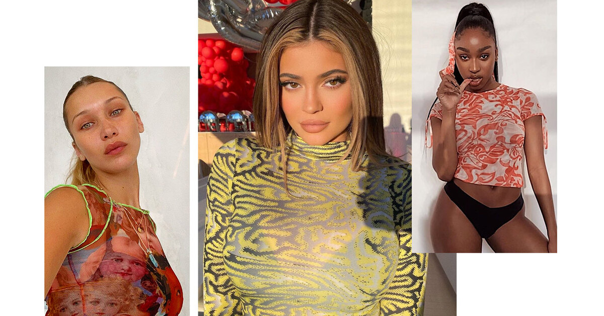 Носим топы из сетки с принтами из 90-х, как у Беллы Хадид и Ким Кардашьян