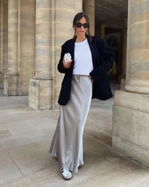 Не самое очевидное, но очень популярное среди модных инфлюенсеров комбо: шелковая юбка и базовая футболка-оверсайз. Пара из категории «сочетание несочетаемого» отлично подходит для самых разных случаев, а еще — обеспечивает комфорт. В жаркую погоду гораздо комфортнее в вещах свободного кроя — они обеспечивают нормальный теплообмен. В комбинации с этими вещами одинаково хорошо будут смотреться кроссовки и босоножки на каблуке — так что выбор за вами.