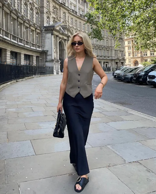 Костюмный жилет в этом сезоне стал не только совершенно самостоятельной единицей гардероба, но и главным хитом лета. В паре с шелковой юбкой он будет смотреться ничуть не хуже, чем с брюками в тон. В качестве обуви сюда идеально подойдут кожаные шлепанцы, а в качестве аксессуара — вместительная сумка. Это комбо одинаково хорошо подойдет и для похода в офис, и для встречи с друзьями в ресторане и для долгой прогулки по летнему городу.