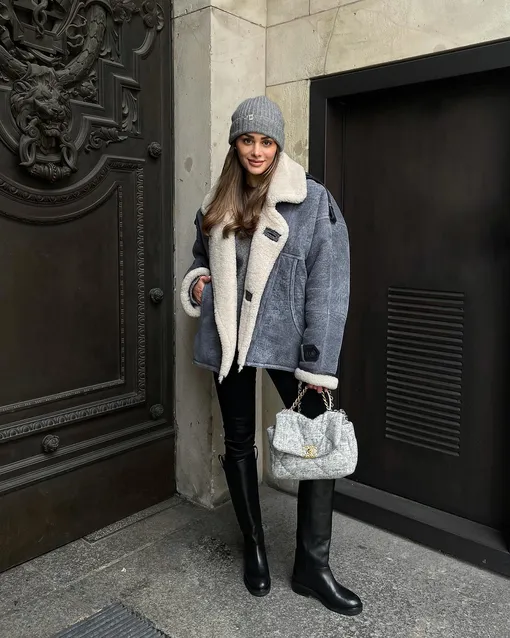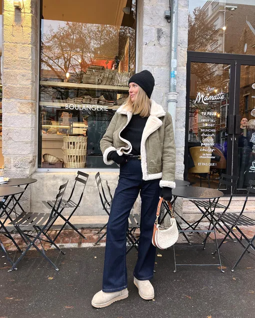 В более расслабленных комбо короткая дубленка смотрится ничуть не хуже. Джинсы, базовый свитер и пара удобных угг — вот идеальная формула повседневного образа. И не забудьте про шапку, перчатки и сумку. Последняя может быть любого размера: от миниатюрной хобо до вместительного тоута — все зависит от того, как много вещей вы хотите взять с собой.