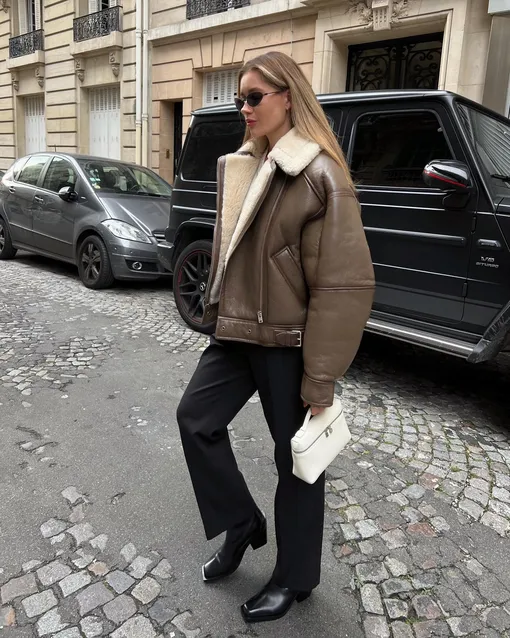 Классическая дубленка-авиатор отлично дополнит широкие шерстяные брюки. В качестве верха подойдет как классический джемпер с круглым вырезом или объемный свитер с высоким горлом, так и «офисная» рубашка или романтичная блуза с бантом. Больше элегантности образу придадут ботильоны — их лучше выбирать на невысоком устойчивом каблуке.