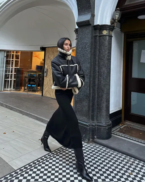Холода — не повод отказываться от элегантных образов. Отличная пара для дубленки — юбка макси из трикотажа или плотной костюмной шерсти. В купе с утепленными колготками согреет не хуже брюк и поможет создать женственный наряд. Обувь сюда подойдет любая: от угг до ботинок челси, однако мы предлагаем сделать ставку на пару высоких сапог на микро-шпильке kitten-heel. Под дубленку надевайте водолазку из полупрозрачного кашемира и не забудьте про аксессуары — они «соберут» образ воедино.