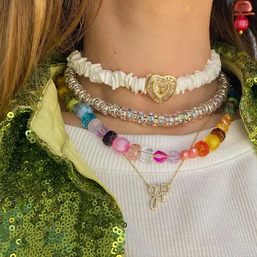 Еще один актуальный вариант чокера — серферское ожерелье. Яркое украшение из цветных бусин украсит любой, даже самый базовый образ. Таким колье можно дополнить аутфит из джинсовых шортов и майки-алкоголички, яркий комбинезон или даже романтичное платье. Минималистам придутся по вкусу однотонные варианты из мелких бусин, а любителям смелых образов рекомендуем сочетать сразу несколько таких ожерелий.