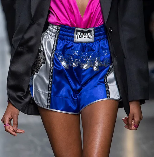 Сегодня эти качества исключительно с мужчинами не ассоциируются — и это к лучшему. Перекочевали в женский — не обязательно спортивный — гардероб и сами боксерские шорты. И они по-прежнему любому образу и любой моднице придают бойкости и решительности. Можно сказать, даже опасности. Вспомним знаменитый выход Наоми Кэмпбелл на шоу Victoria’s Secret в 1997 году. Боксерские шорты, спортивный топ с золотом, развевающийся за спиной халат, уверенный взгляд — кто бы решился встать у такой девушки на пути? В 1996 подиум превращала в ринг команда Chanel. Не раз обыгрывали боксерскую тему и на показах Versace. Например, на мужском показе F/W 2019 на подиум выходили девушки в боксерских шортах.