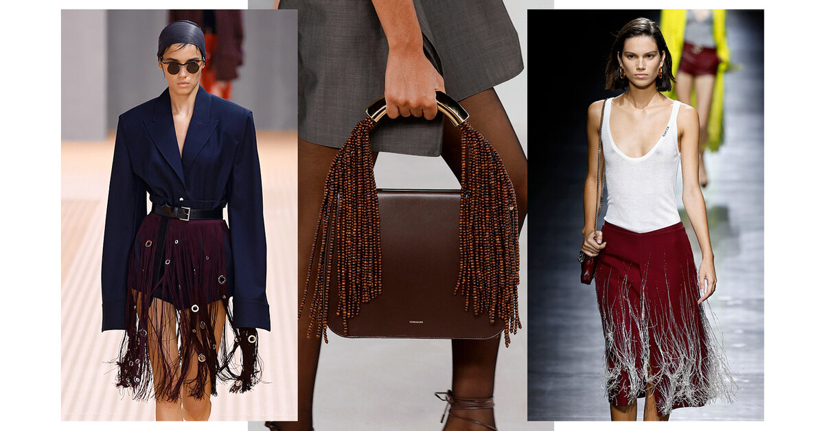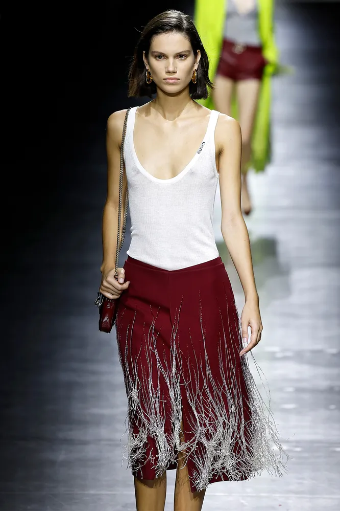 Глобально модные вещи с бахромой можно разделить на две категории: те, где бахрома выполняет роль лаконичной отделки, и те, которые буквально из нее состоят. Первые в избытке нашлись в дебютной коллекции Сабато де Сарно для Gucci: дизайнер украсил тончайшей серебристой бахромой и элегантные юбки с разрезом спереди, и пальто ярко-зеленого цвета, и платья мини и даже топы. У Khaite бахрома превратила платья мини в макси, а в прощальной коллекции Сары Бертон для Alexander McQueen — украсила классические брючные костюмы, превратив их в эффектные выходные наряды. И, конечно, отказаться от любимого элемента дизайна не смог и главный поклонник бахромы Матье Блази: в весенне-летней коллекции Bottega Veneta она украсила самые разные вещи — от топов до юбок.