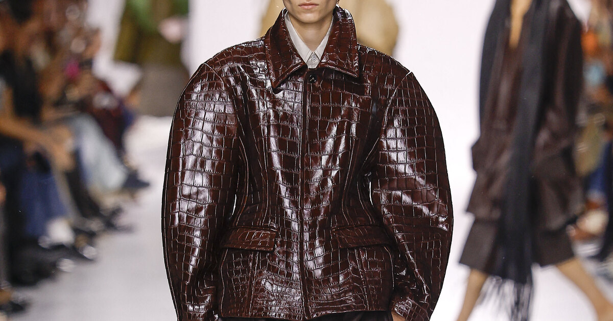 В холодные месяцы тотал-кожа работает безотказно. У Khaite, Chanel и Boss — вариации на тему юбки-карандаш и куртки с высоким воротником. Bottega Veneta продвигает дуэт брюк и куртки — минималистичный, но максимально выразительный. Особенно с учетом их культового плетения Intrecciato. Acne Studios предлагает кожаные джинсы и жакет, создавая иллюзию привычного денима. И, конечно, вечерняя версия: Brandon Maxwell показывает, как топ и брюки из кожи превращают лук в лаконичный вечерний манифест.