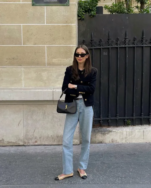 Сложно придумать более классическое сочетание, чем джинсы и пиджак: это удобно, красиво и уместно в любой ситуации. Если хотите добавить образу больше парижского шика, замените классический пиджак прямого кроя твидовым жакетом. Конечно, к такому образу балетки придутся как нельзя кстати.
