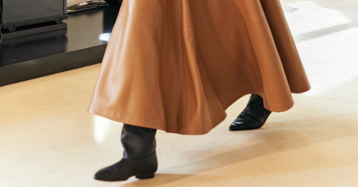 Пришло время выбирать актуальные сапоги. К юбке А-силуэта подойдут любые модели: на kitten-heel, устойчивом каблуке или на плоском ходу, сапоги-гармошки или чулки — все зависит от ваших предпочтений. Что касается материала, то остановиться стоит на паре из кожи, как на шоу Sandy Liang. Такие будут более практичны в дождливую погоду, в отличие от замшевых опций. А если вы хотите выглядеть выше, то обратите внимание на сапоги в тон юбки. Такой стайлинг трюк визуально вытянет силуэт.