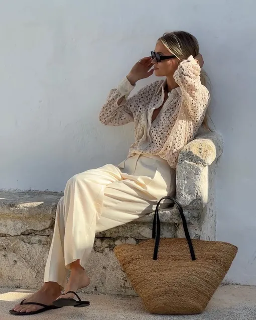 Вариант для тех, кто ищет более элегантное комбо — льняные брюки и мюли на каблуке. Эту изящную летнюю обувь давно полюбили модницы по всему миру, и это неудивительно: больше не придется беспокоиться о сложных застежках и вечно развязывающихся шнурках - у этой обуви нет ни того, ни другого. Чтобы такое сочетание смотрелось действительно гармонично, мюли рекомендуем выбирать максимально простого дизайна.
