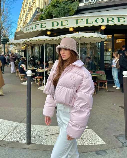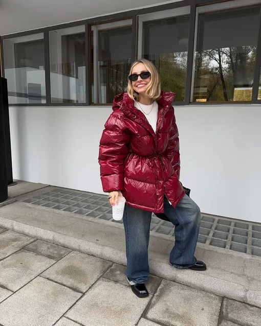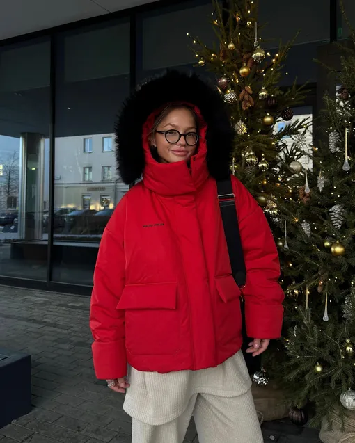 Перечисляя тренды, нельзя не отметить и яркие цвета пуховиков. Уже не первый год лидер в этой категории — красный. Он гармонично смотрится в любом луке и при этом делает его гораздо интереснее. Правда, носить его лучше с самой базовой одеждой — иначе аутфит рискует получиться «перегруженным». Ну а идеальная длина пуховика — чуть ниже бедра. Такой и согреет, и будет комфортен в носке.