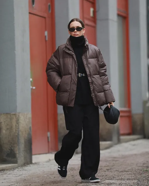 Еще модные цвета пуховиков на 2025 год — все оттенки зеленого. Вы, конечно, можете подобрать любой вариант, но мы решили остановиться на наиболее универсальном — оливковом. Он не вызывает сложностей со стилизацией и при этом смотрится очень эффектно. Особенно если сочетать его с одеждой темных оттенков: черным, темно-синим или бордовым. Впрочем, можете вообще одеться в оливковый с ног до головы — выйдет нетривиальный монохромный аутфит.