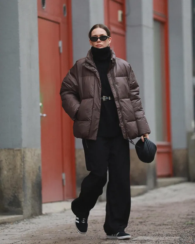 Еще модные цвета пуховиков на 2025 год — все оттенки зеленого. Вы, конечно, можете подобрать любой вариант, но мы решили остановиться на наиболее универсальном — оливковом. Он не вызывает сложностей со стилизацией и при этом смотрится очень эффектно. Особенно если сочетать его с одеждой темных оттенков: черным, темно-синим или бордовым. Впрочем, можете вообще одеться в оливковый с ног до головы — выйдет нетривиальный монохромный аутфит.