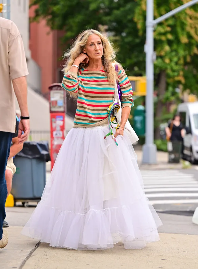 К сериалу «И просто так» — продолжению культового «Секса в большом городе» — можно относиться абсолютно по-разному. После его просмотра зрители разделились на два лагеря: одни были бесконечно рады возвращению любимых героинь, другие же разочаровались из-за неожиданных сюжетных поворотов и связанных с выходом шоу скандалов. Тем не менее, с полной уверенностью можно говорить об одном: главная героиня, писательница (а теперь еще и ведущая подкаста) Кэрри Брэдшоу, по-прежнему умеет задавать тренды как никто другой. После выхода сериала Fendi перевыпустили ее любимую сумку Baguette в фиолетовых пайетках, а платья Valentino стали пользоваться повышенным спросом в сети (все дело в ярко-оранжевом кутюрном наряде бренда, в котором в финале сериала героиня гуляет по Парижу). Судя по всему, на очереди еще один тренд от иконы стиля из Нью-Йорка: сочетание небрежного «дедушкиного» свитера и нарядной и пышной юбки-пачки.