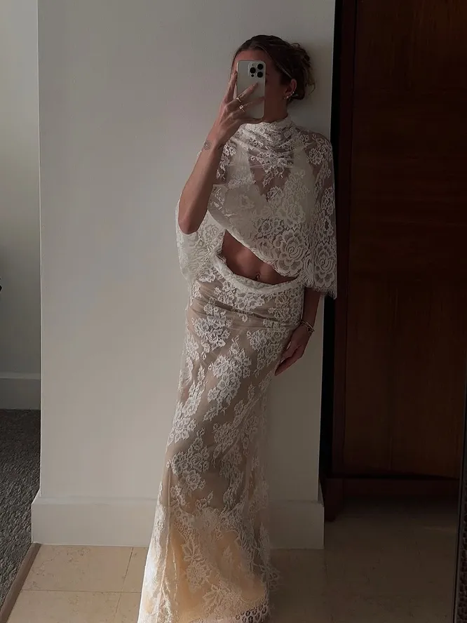 Но что делать, если не хочется надевать платье? В таком случае на его место может прийти костюм из юбки и блузы или нарядного топа. Важно — эти предметы одежды не должны походить на тот самый корпоративный образ, который вы каждый день надеваете в офис. Речь скорее идет о более праздничных и элегантных вариациях — например, о шелковой миди в нежном молочном оттенке, сатиновой рубашке, которая стильно переливается при ходьбе, или полупросвечивающей накидке из гипюра. Еще один беспроигрышный вариант — укороченное платье-мини, логическим продолжением которого становится прозрачная черная юбка из винтажного кружева.