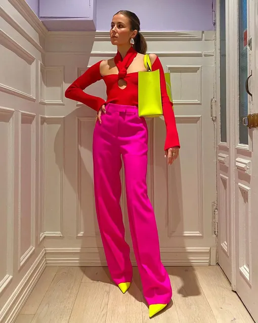 Появлением этого сочетания цветов на модной арене мы обязаны легендарному Иву Сен-Лорану. В коллекциях французского кутюрье алый не раз встречался в тандеме с сочной фуксией. Секрет этого эффектного комбо — в предельной яркости оттенков. При этом, как ни странно, они сосуществуют друг с другом гармонично и ни один не перетягивает внимание на себя. Красный и фуксия могут встречаться в образе в равной степени, либо один из них может доминировать. Этот вариант более простой и «безопасный»: попробуйте добавить к розовому платью красные аксессуары. Те, кто считает себя настоящим профи в колористике, предлагаем поэкспериментировать и добавить третий цвет — например, желтую обувь или сумку.