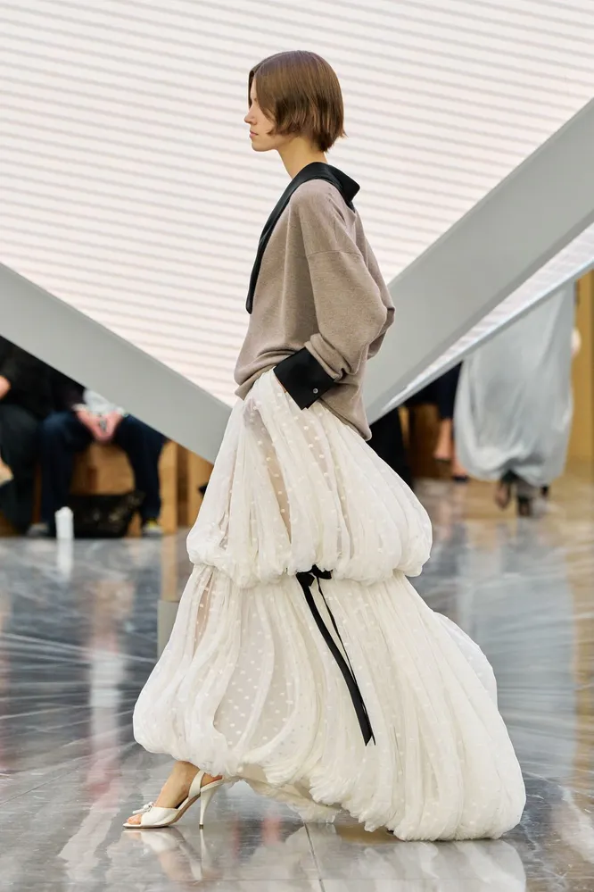 С исторической точки зрения эта тенденция тоже спорная. Кринолины, панье и похожие конструкции были напрямую связаны с социальной иерархией. Они демонстрировали ранг и неприкосновенность, скрывая тело, а не подчеркивая его. Они символизировали статус, а не свободу. Возвращая такие силуэты, бренды вряд ли предлагают реальное принятие. Скорее, наоборот, рекомендуют спрятаться за архитектурой ткани. В итоге тренд прекрасно работает на подиуме и фэшн-съемках. Но в повседневности широкие юбки, массивные рукава и нарочито расширенные бедра оказываются пригодными лишь в рамках эксперимента. Так, возникает новый парадокс: вроде бы мы говорим о расширении границ, о свободе, но вид этих силуэтов формируется на одном-единственном типе тела — тонком, хрупком. Нам предлагают свободу, которая на деле доступна только тем, кто и без того соответствует жестким требованиям индустрии. Да, на шоу это выглядит драматично и красиво. Конечно, можно вдохновиться этими луками. Но относиться к ним стоит как к стилистической фантазии, а не инструкции к действию. И этот «театр объема» звучит как красиво поданная, но все же уловка.