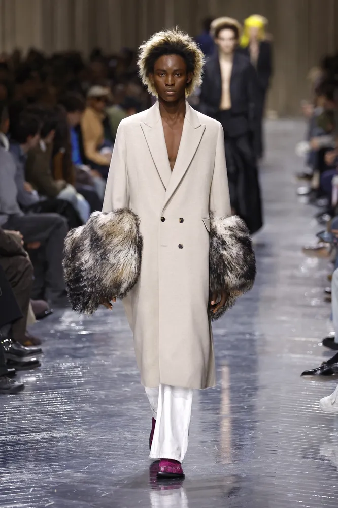 Мы привыкли к тому, что все образы с шубой — это пик гламура и роскоши. Однако Dolce&Gabbana готовы развеять этот миф. Для этого им понадобилось замиксовать верхнюю одежду из меха с максимально расслабленными и комфортными вещами — объемным свитером с воротником хенли и широкими шерстяными палаццо.