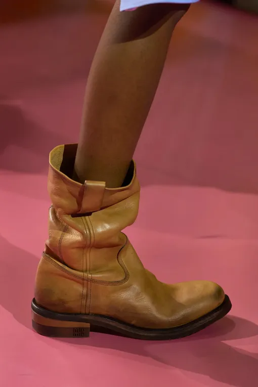 В коллекциях весна-лето 2026 дизайнеры предлагают разные прочтения одного и того же кода. Где-то это классика с вышивкой и острым мысом, где-то более мягкие варианты из светлой кожи, которые выглядят более расслабленно. На подиуме бренды Acne Studios, Miu Miu, Maison Margiela и Comme des Garçons представили как высокие версии, так и короткие.