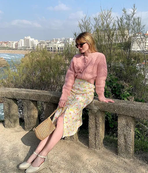 Инфлюенсеры делают ставку на платья-халаты или более открытые комбинации. Главная их особенность – жизнерадостный цветочный принт. Например, такие сейчас можно найти в коллекциях Reformation, Isabel Marant Ètoile или Zimmermann. А чтобы образ получился гармоничным и нежным, французские модницы подбирают к платью кардиганы пастельных оттенков. Так, Сабина Сокол свою комбинацию с яркими розами носит с мягким джемпером на пуговицах приглушенного мятного цвета.
