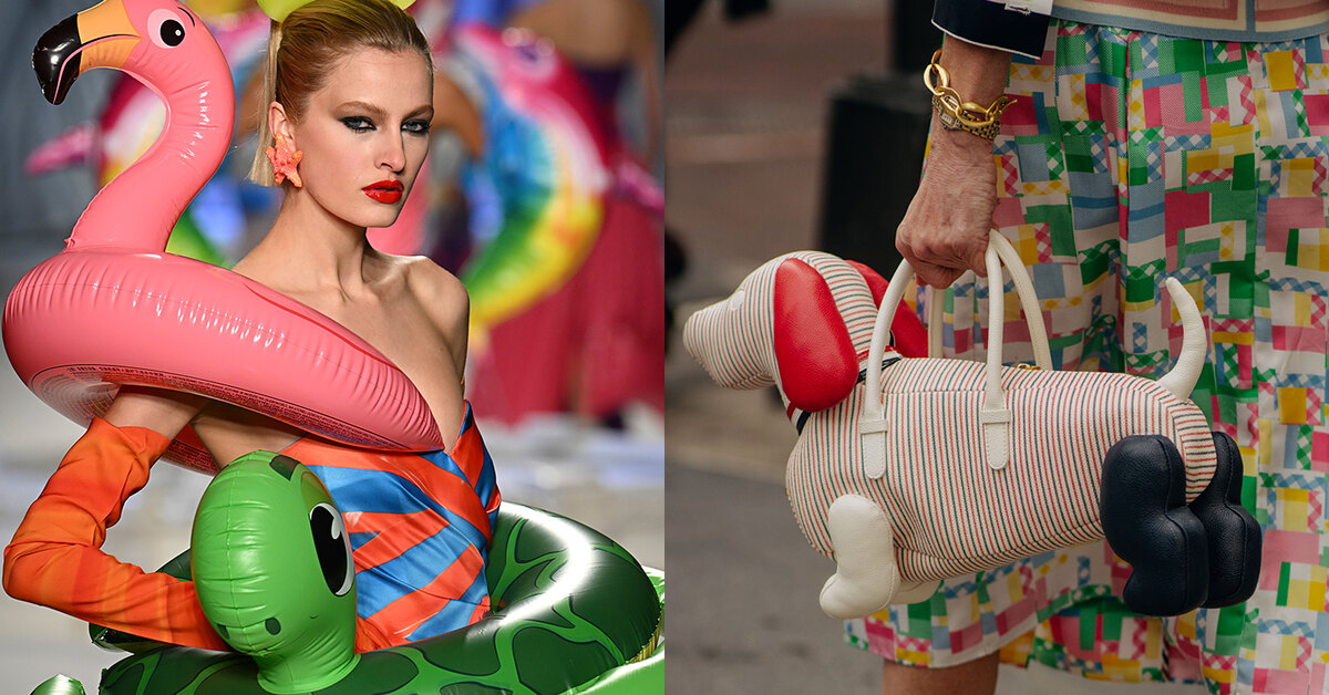 Больше всех отличился Джереми Скотт. Его коллекции для Moschino всегда отличаются инфантильностью: то он переосмыслит упаковки еды McDonald's в форме сумок и украшений, то выдаст моделям бутылочки для молока и «детские» колье, будто собранные из конструктора. На этот раз он обратился к надувными кругам, матрасам и нарукавникам для отдыха у бассейна, которые превратил в яркие платья и дутые жакеты. Алессандро Микеле сделал своей музой Гизмо из «Гремлина»: портреты очаровательного создания появились на платьях, а мягкие игрушки Гизмо засели в сумках из новой коллекции Gucci.