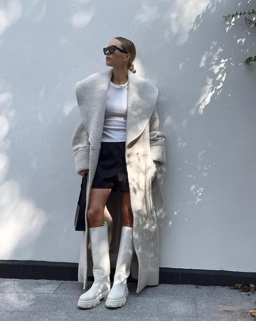 Начать стоит с выбора обуви: высокие сапоги как-будто были придуманы для того, чтобы носить их с мини-юбкой. Если в таком ультраженственном образе вам некомфортно, просто замените сапоги любимыми тяжелыми ботинками, наденьте укороченный свитер или водолазку и почувствуйте себя школьницей.