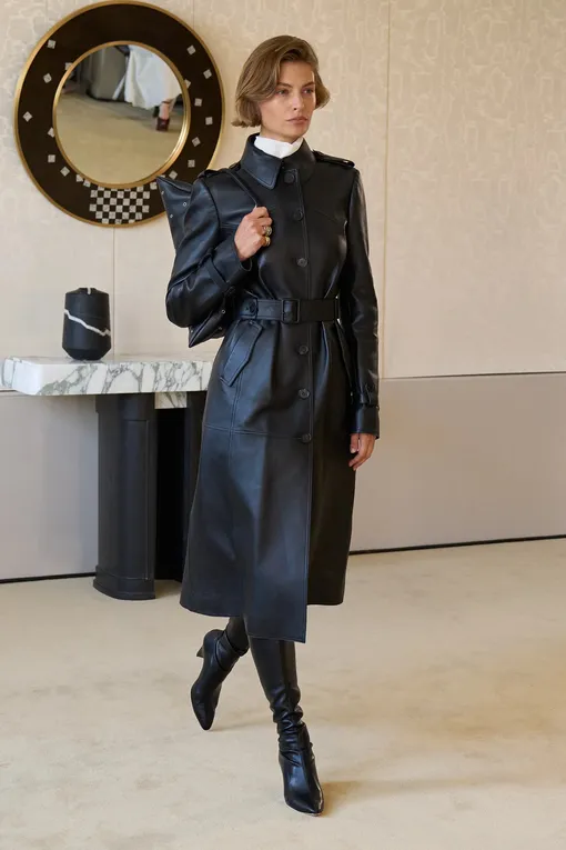 Весной кожаные пальто снова окажутся в центре внимания, но среди множества вариантов дизайнеры выделяют один — однобортное пальто с глухим отложным воротником. В нем нет показной декоративности, зато есть ощущение архитектурного силуэта. Длина варьируется: от середины бедра до мидакси. Выбор зависит только от ваших пропорций фигуры и настроения. Дальше в игру вступают детали. У Altuzarra — ремень и накладные карманы, а в Bottega Veneta Луиз Троттер делает ставку на широкую линию плеч в духе power dressing 80-х и съемный воротник, позволяющий менять характер всего ансамбля. Loewe предлагает более расслабленную интерпретацию — пальто-кокон с удлиненными рукавами. Несмотря на разницу подходов, все эти модели объединяет одно: закрытый отложной воротник, задающий более строгое классическое настроение. Цветовая палитра не ограничивается классикой. Черный, коричневый и бежевый по-прежнему актуальны, но рядом с ними уверенно звучат охра и хаки. Эксперименты касаются и фактуры: матовая кожа соседствует с лаковой, а также с анималистичнным тиснением.