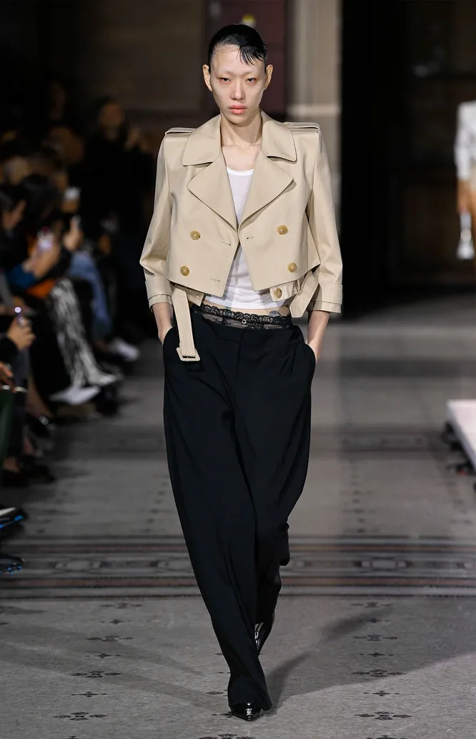 По большому счету, это все тот же тренч: два ряда пуговиц, отложной воротник, «погоны» на плечах и даже пояс — просто его будто отрезали по линии талии. Эта модель стала настоящим хитом весенне-летней коллекции Coperni, а затем короткий тренч похожего кроя появился в коллекции Sacai, правда уже в осенне-зимнем сезоне. И это определенно хорошая новость: короткий тренч можно купить сейчас и не переживать о том, что он потеряет актуальность в следующем сезоне.