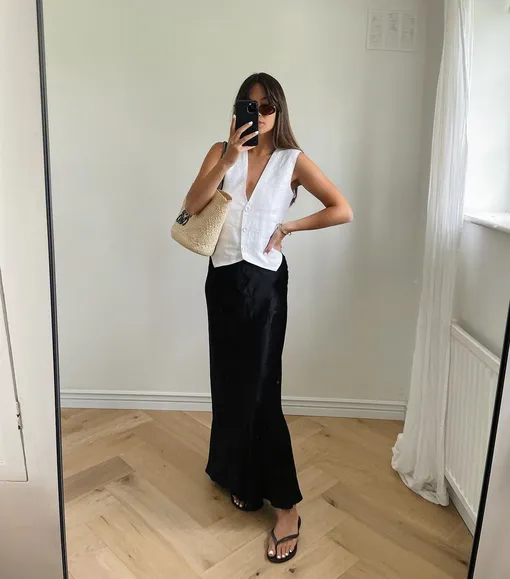 Костюмный жилет в этом сезоне заметно потеснил топы, блузы и даже пресловутые майки-алкоголички. При этом с юбкой макси он будет смотреться ничуть не хуже, чем с джинсами или брюками из льна. Если хотите визуально вытянуть силуэт, составляйте монохромный образ из юбки и жилета одного оттенка, а если хотите сделать акцент на одной из составляющих образа, с этой задачей лучше справятся контрастные цвета.