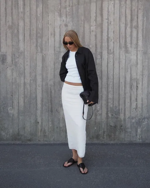 Еще одно «вечное» комбо — трикотажная майка и расстегнутая рубашка поверх. Они могут быть одного цвета или контрастные — здесь все в ваших руках. Юбку можно выбрать любую: от льняной до трикотажной, значение имеет только длина. Такой образ можно сделать более строгим или более расслабленным при помощи пары обуви и аксессуаров, так что рекомендуем взять на заметку.
