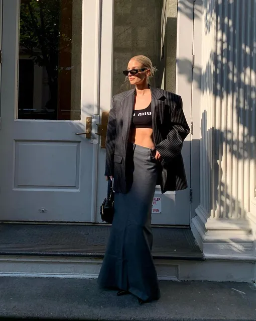 В нашем климате летняя погода редко бывает устойчивой, так что вот вариант на более прохладную погоду. В пару к макси выбирайте плечистый объемный жакет. Если в вашем гардеробе имеются сочетающиеся опции — отлично: костюмы с юбкой по-прежнему популярны. Впрочем, расцветки этих элементов образа могут отличаться. Под жакет надевайте топ: он может быть коротким (если вы готовы показать всем свой безупречный пресс) или обычной длины. Обувь к такому луку подойдет буквально любая.