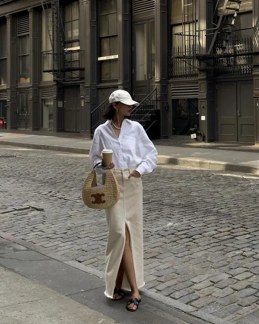 Комбо из классической рубашки + юбки макси, в котором однажды Шэрон Стоун пришла на «Оскар» и поразила всех, сейчас давно превратилось в классику. Юбка может быть из денима, шелка, льна, хлопка или тонкой костюмной шерсти — здесь все зависит от того, что уже есть в вашем гардеробе. В целом, рубашку можно надеть любого цвета, но мы бы советовали остановиться на варианте белого цвета. Эта классика никогда не теряет своей актуальности.