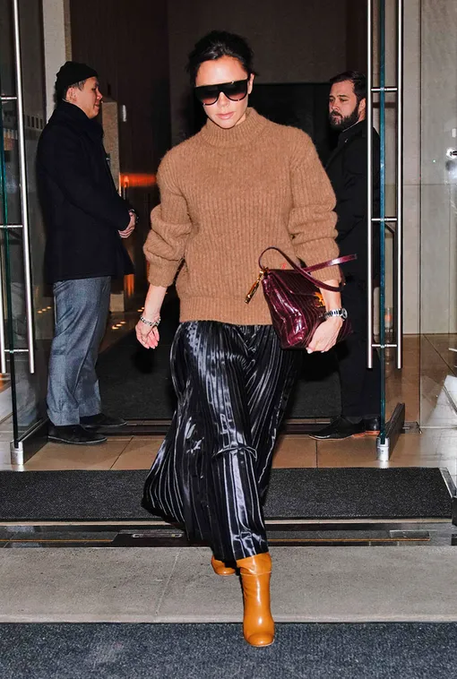 Виктория Бекхэм обожает юбки ниже колена. Чаще всего она выбирает модели с атласным блеском и комбинирует их с объемными шерстяными свитерами. За счет сочетания разных фактур даже монохромный образ кажется интересным и привлекающим внимание. Предлагаем взять эту идею на вооружение и, пока еще есть возможность носить любимые свитера, претворить ее в жизнь.