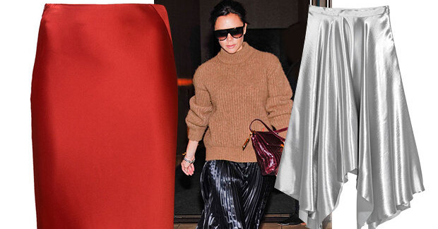 10 атласных юбок, чтобы носить их с уютными джемперами и выглядеть как Виктория Бекхэм