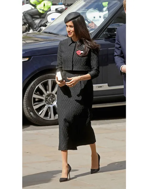 Надо признать, что Маркл органично влилась в «королевскую» жизнь. Девушка имеет все шансы стать иконой стиля, составив достойную конкуренцию Кейт Миддлтон. Она уже освоила придворный этикет и дресс-код. Итак, на службе Маркл появилась в образцовом наряде: короткий жакет и юбка длины миди из жаккардовой ткани от Emilia Wickstead, дополненные лодочками и изящной шляпкой.