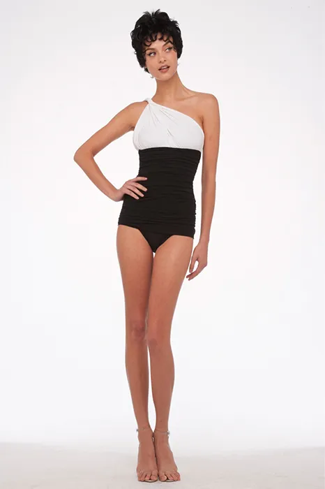 Слитный черно-белый купальник Chanel – скорее «вечерний» вариант: приберегите его для коктейлей у бассейна.