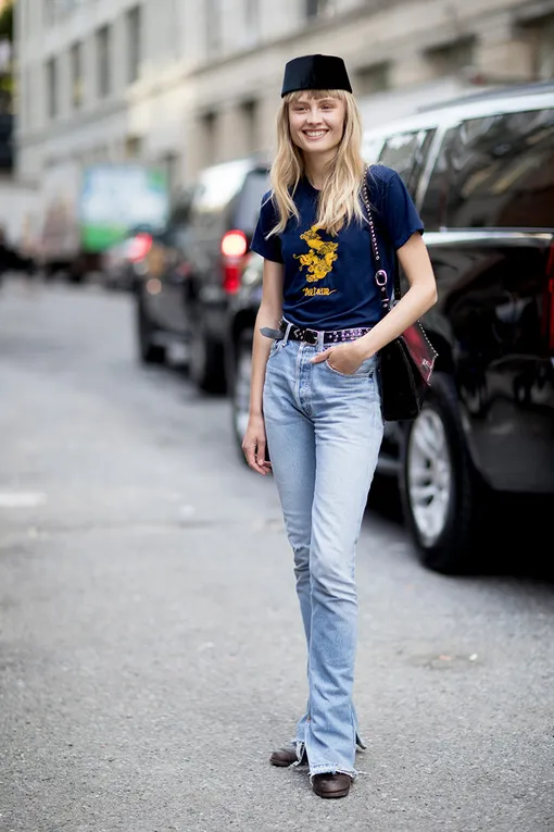 Это могут быть модели прямого кроя, зауженные к низу или ультрамодные клеш: главное, выбирать джинсы классических оттенков вроде темно-синего, серого и черного и с минимумом декора и объемных деталей — карманов, вышивки, аппликаций. Например те, что есть в нашей подборке.