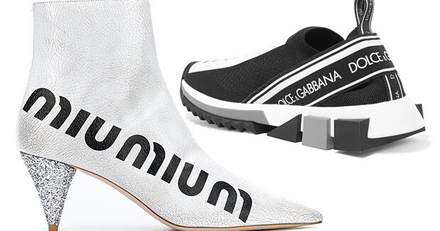Носить на груди майки с логотипами любимых брендов мы привыкли. Даже целые костюмы, расписанные названием любимого Дома, уже не удивляют — помните недавний выход Хейли Болдуин в Versace? А вот то, что броскими логотипами украшают еще и обувь, по-прежнему непривычно. Речь идет не только о резиновых шлепках и кроссовках, но даже о вечерних туфлях! Особенно отличилась на этом поле команда Miu Miu, которая собственными логотипами исписала, кажется, все свои доступные модели.