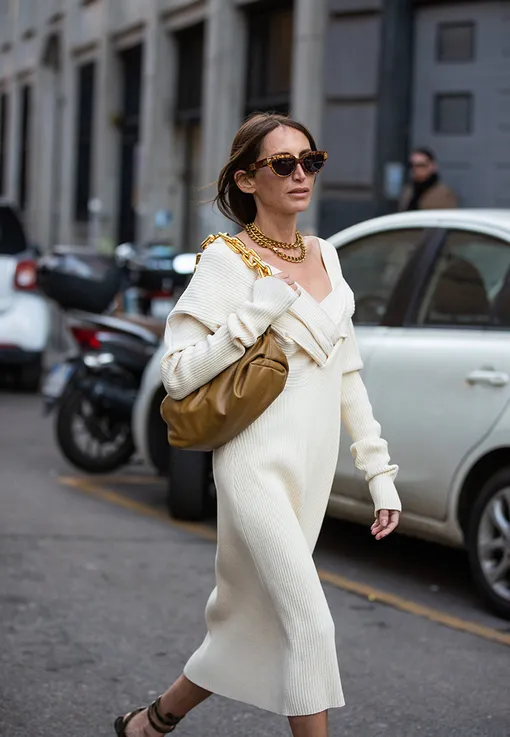 Сочетайте вязаное платье с пальто или кожаным тренчем и высокими сапогами на каблуке, как это делает Кендалл Дженнер. Чтобы платье не смотрелось скучно, обратите внимание на детали: квадратный вырез, как у Bottega Veneta, модный сексуальный разрез, как у Totême, или актуальные объемные рукава, как у Off-White. Выбирайте сочные весенние оттенки: например, горчичный от Theory, или зефирно-розовый от Balenciaga. Еще один тренд - платье в стиле колорблок с резкой границей двух цветов, как у Gabriela Hearst. Такой прием поможет визуально вытянуть фигуру. Дополните образ крупными серьгами и структурной акцентной сумкой (вдохновляемся образом Хлои Севиньи, или разбавьте спокойное платье броскими массивными цепями (следуем примеру Рианны).