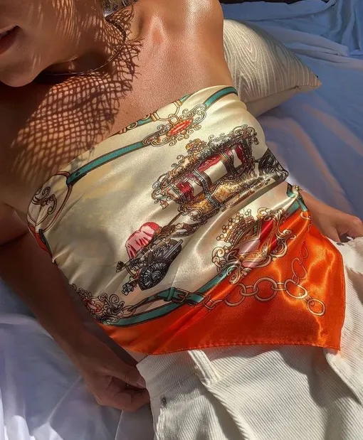 Как же стилизовать такие модели? Самый популярный вариант, с которого стоит начать — в роли косынки. Это лучшая альтернатива соломенной шляпе или трикотажной панамке, поскольку шелковый платок занимает очень мало места в сумке или чемодане, поэтому брать его с собой в путешествие к морю — прекрасная идея. Кроме того, завязывать этот аксессуар, который защитит голову от прямых солнечных лучей, можно самыми разными способами — от банданы с выпущенными назад краями до косынки в духе Одри Хэпберн и многослойного тюрбана. В пользу удобства и универсальности шелкового платка также говорит и возможность заменить им любой летний топ — от простой майки-алкоголички с американской проймой и белой футболки до шелковой блузы без рукавов и крестьянской рубашки. В таком случае надо убедиться, что размера платка достаточно, чтобы завязать его на спине. Также стоит проверить, не просвечивает ли этот деликатный «дышаший» материал.