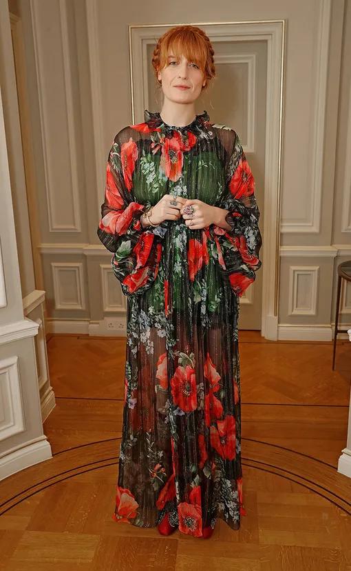 Длинные платья такая же неотъемлемая часть стиля Флоренс, как и ее рыжая челка. На хрупкой фигуре девушки прекрасно смотрятся блестящие ткани и длинные летящие рукава. Она не боится необычных цветовых сочетаний и часто выбирает высокий воротник. Вместе с кружевом и бантами в качестве декора он отсылает нас к викторианской эпохе, которая то и дело возвращается на подиумы.