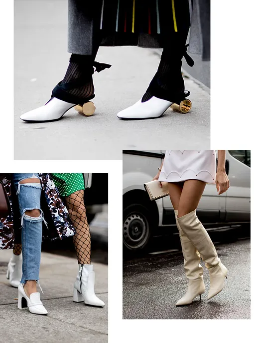 Наконец-то белый сместил черный с пьедестала самого универсального цвета обуви. На смену вечным белоснежным кроссовкам пришли туфли на каблуке kitten heel, мюли и ботильоны, которые по тому же принципу, что и кеды, сочетаются абсолютно со всем. Завсегдатаи хроник стритстайла давно взяли этот прием на вооружение. На нью-йоркской неделе моды каждая вторая модница была замечена в светлой обуви. И если сначала идея о белых туфлях осенью кажется абсурдной, то поверьте, шагать в них по желтой листве — особое удовольствие.