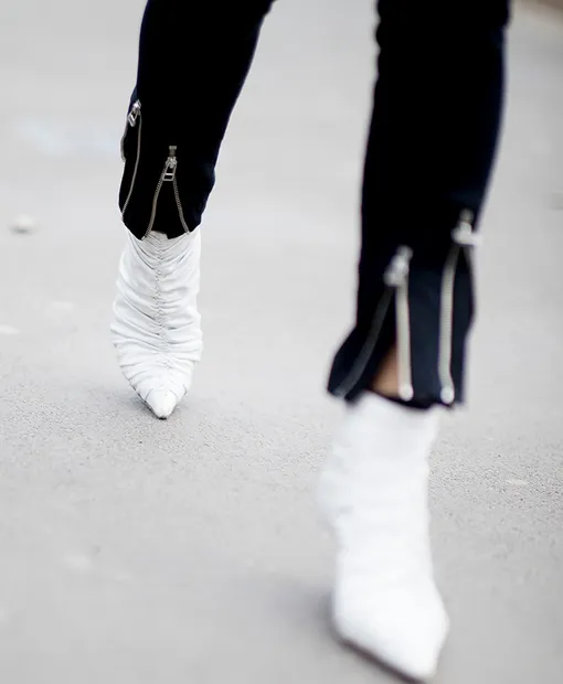 На снимках стритстайл-хроник с прошедших недель моды едва ли не каждая третья девушка в светлой обуви. И тому есть простое объяснение: белые ботильоны способны освежить любой наряд, не перегрузив его. Единственное, нужно внимательнее смотреть прогноз погоды перед выходом из дома: в периоды, когда особенно активно тает снег и проезжающие мимо машины так и норовят окатить вас из лужи, белоснежные полусапоги лучше не надевать. В остальные же дни — когда сухо, солнечно и тепло — стоит дать им зеленый свет.