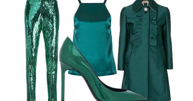 15 платьев, тренчей, брюк и сумок в изумрудной гамме