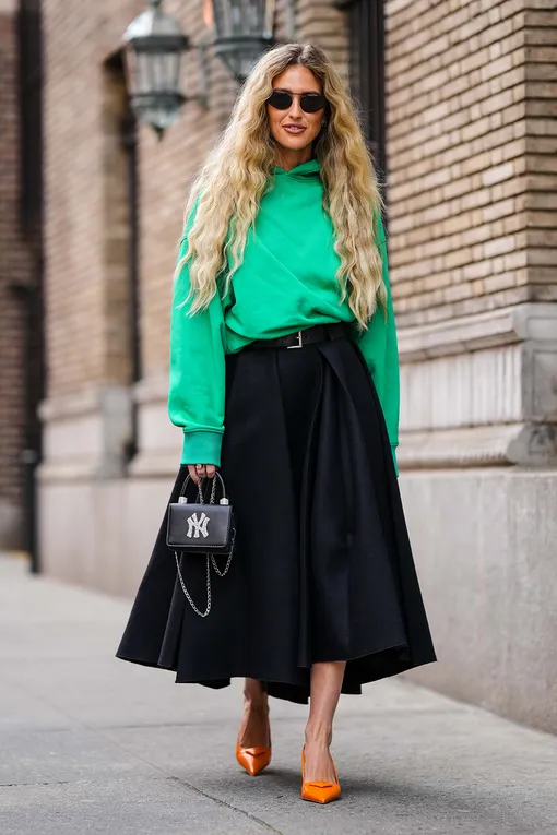 Институт цвета Pantone объявил оттенок грядущего года. В результате в 2024-м на смену Viva Magenta пришел Peach fuzz, или просто персиковый. И так совпало, что он очень к лицу блондинкам. Комбинируйте этот оттенок с розовым, голубым, синим или приглушенным зеленым. Стильная и простая формула — персиковый верх и нейтральный низ. Это может быть джемпер или кардиган в сочетании с джинсами или брюками. Еще одна классная комбинация — персиковый + черный. Например, вы можете взять персиковую сатиновая миди юбку и дополнить ее черной водолазкой. Носите ее с полупрозрачными черными колготками и грубыми ботинками.